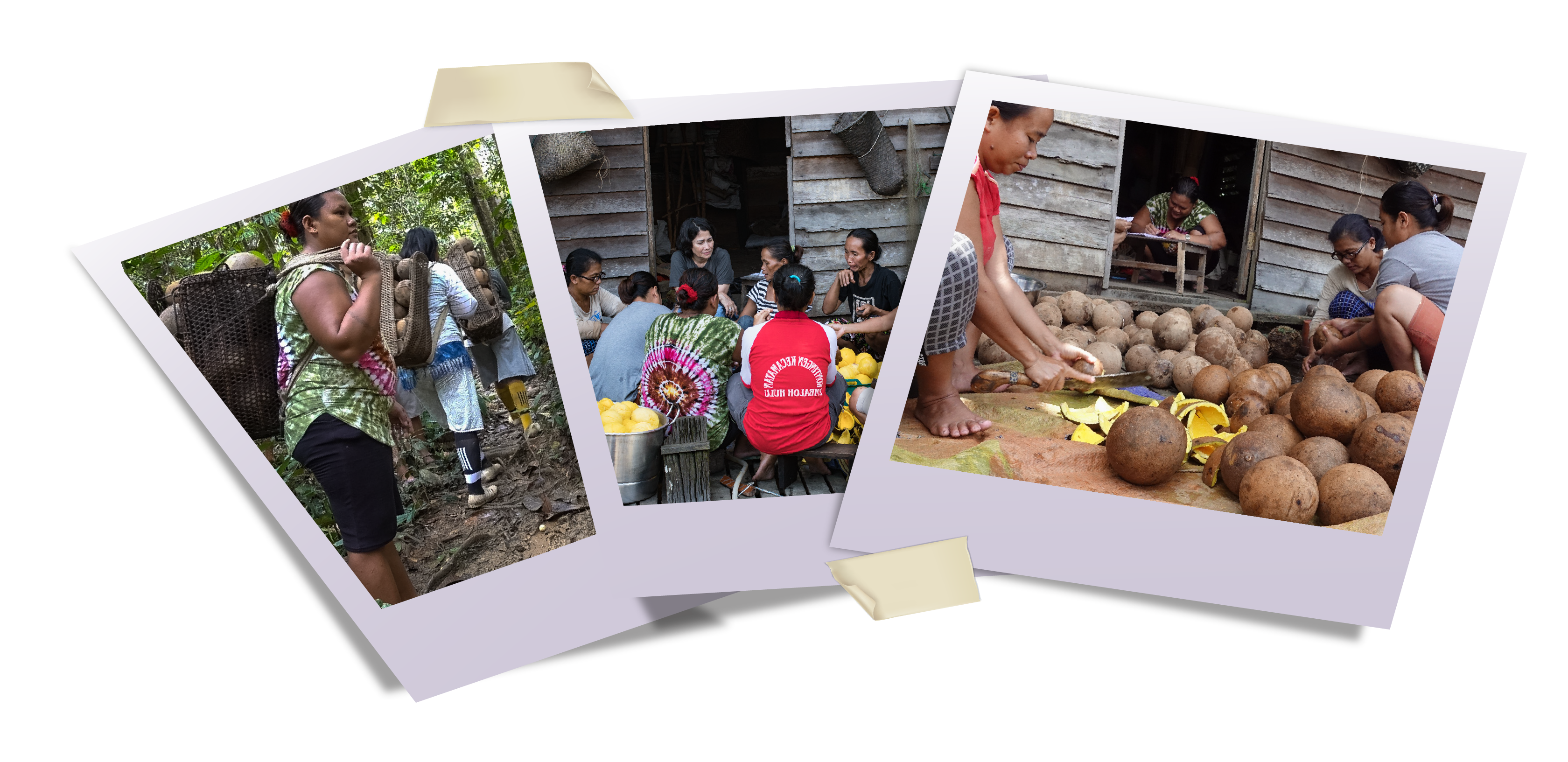 Those big brown fruits looked a like coconut and it was a wild mango. It has a lovely fragrant smell, a combination of mango and passion fruit. Together with Sungai Utik women, Sekar Kawung developed a jam, a cordial and mawang tartlets with this fibrous fruit. It took us a few seasons to figure out how to create pure pulp separated from this fiber. Nowadays, products can be enjoyed by eco-culture travelers who visit Sungai Utik.